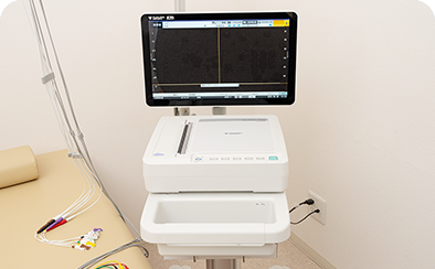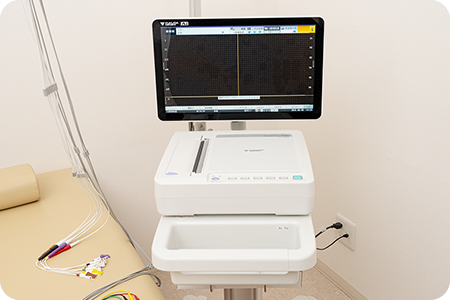 日々の心臓の活動を記録するため24時間装着する機器です。不整脈や狭心症など、通常の検査では捉えにくい疾患の検査に向いています。